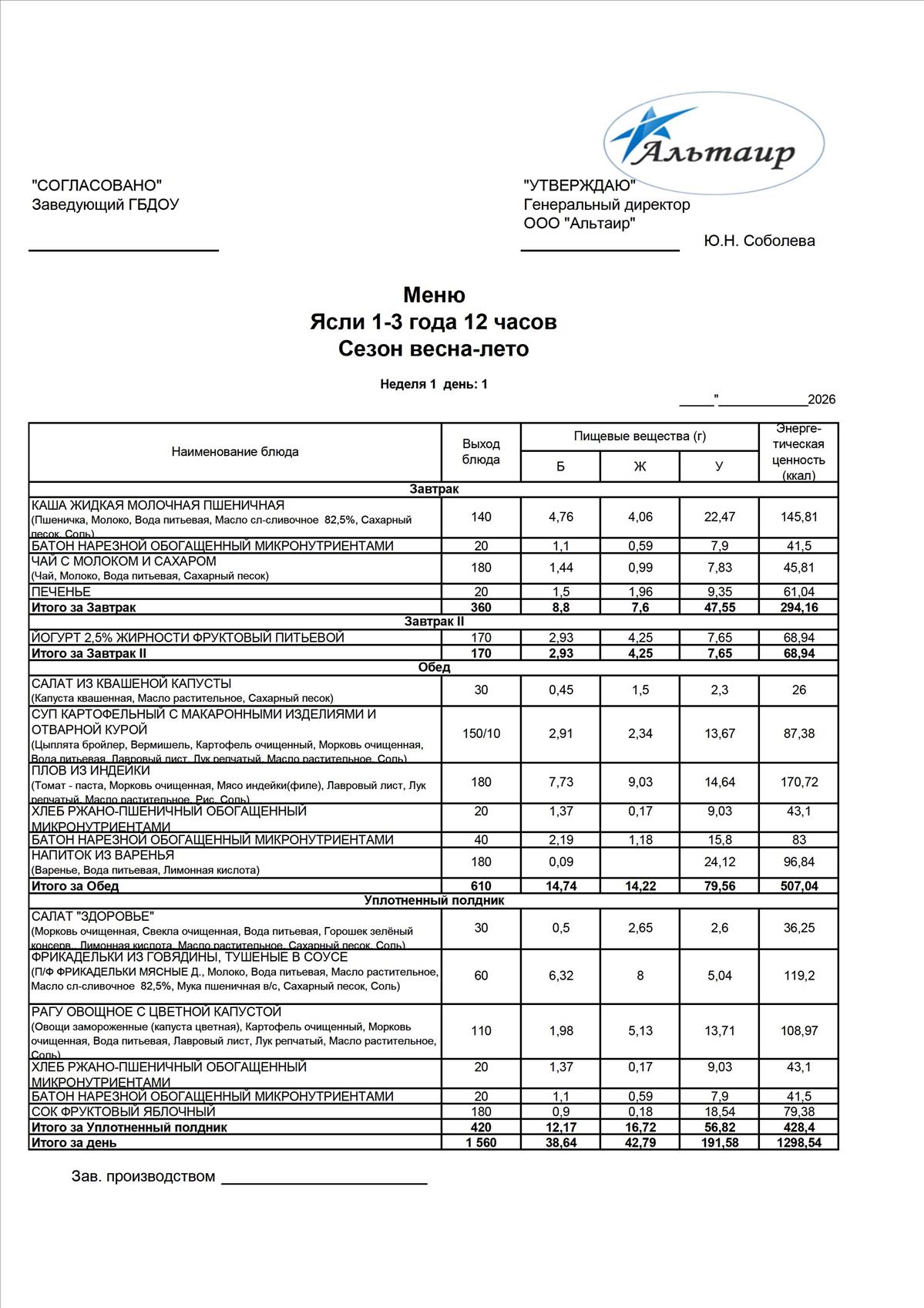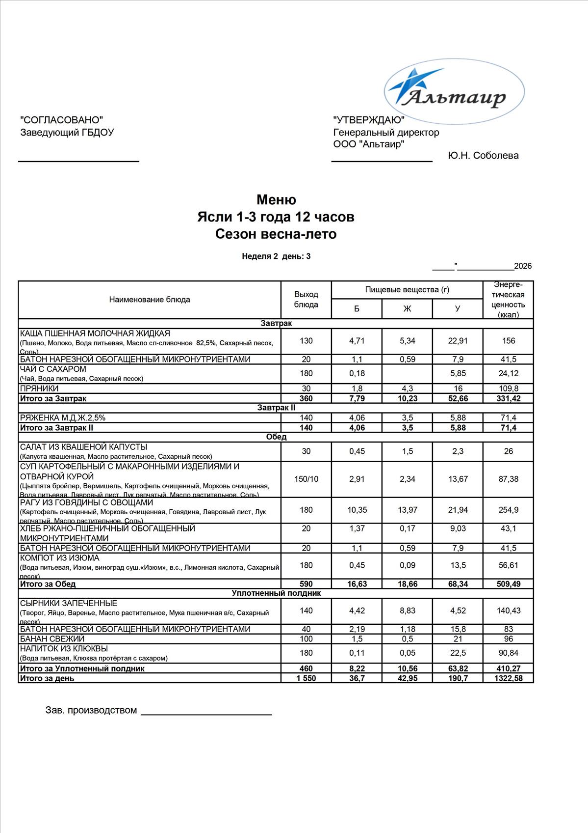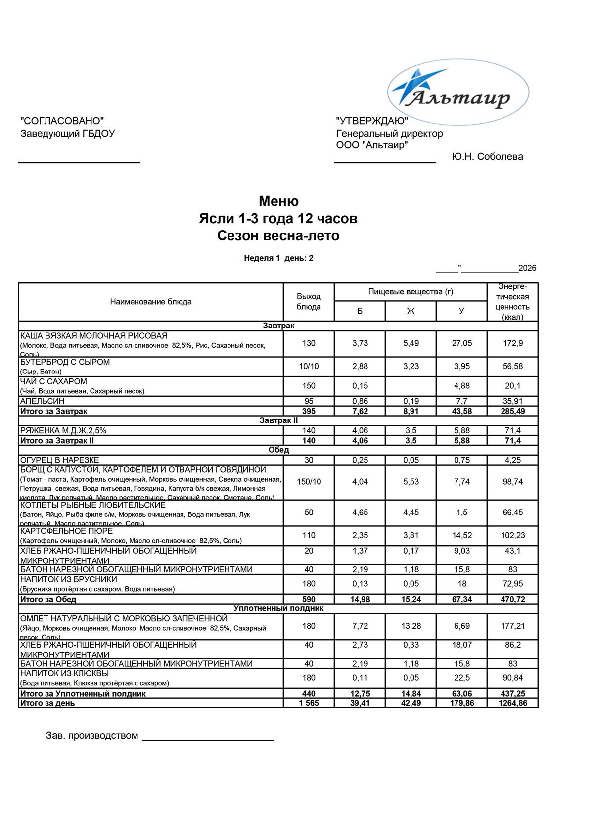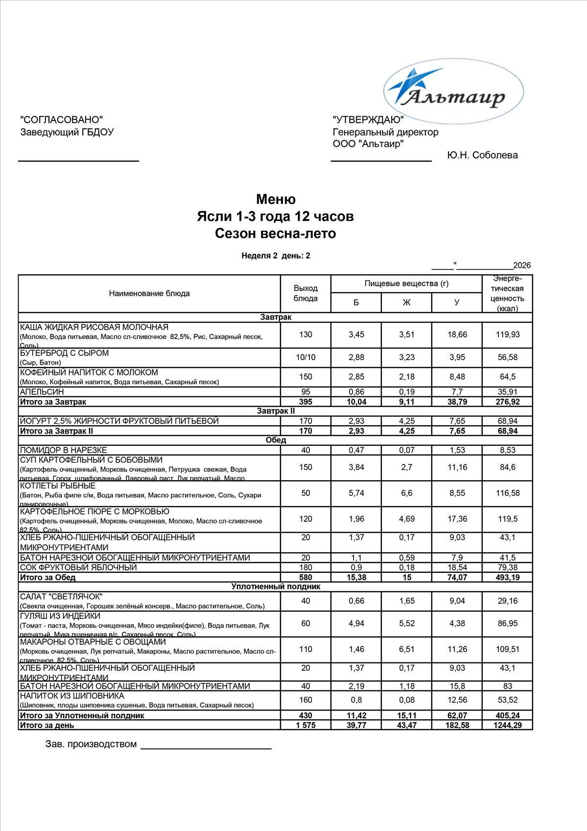 Меню для детей ясельного возраста (1 - 3 года) с пребыванием 12 часов