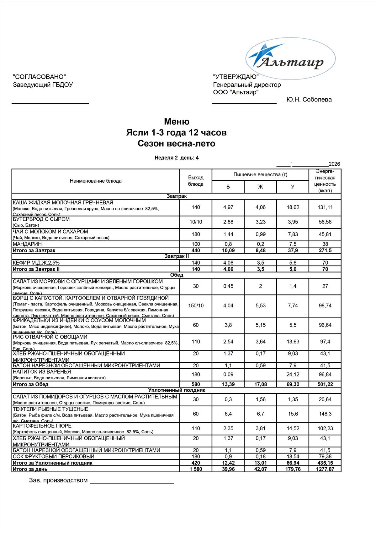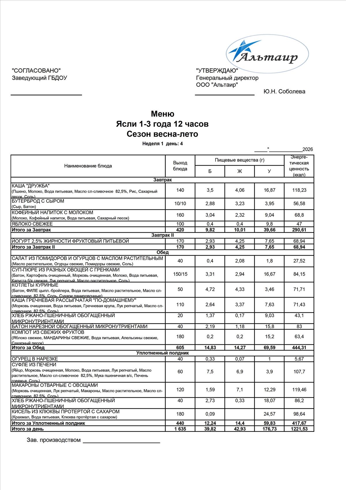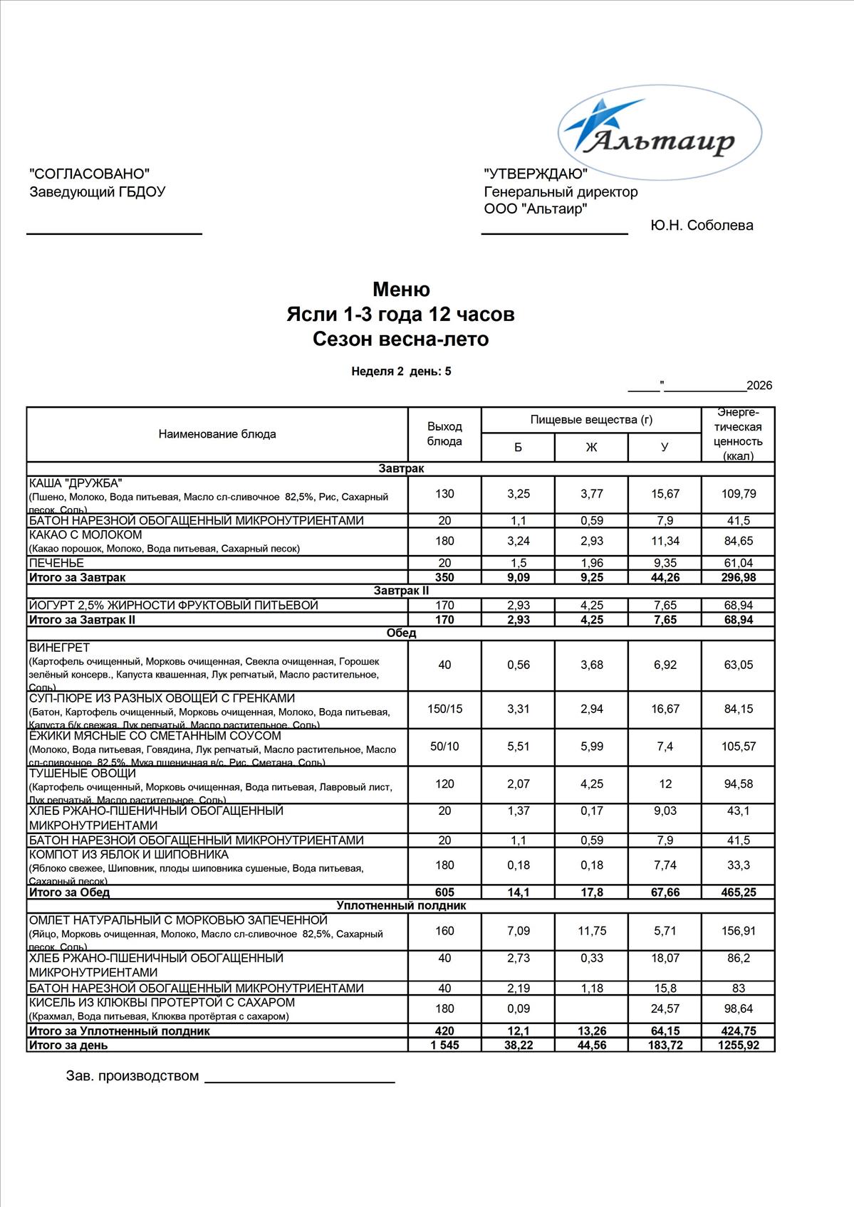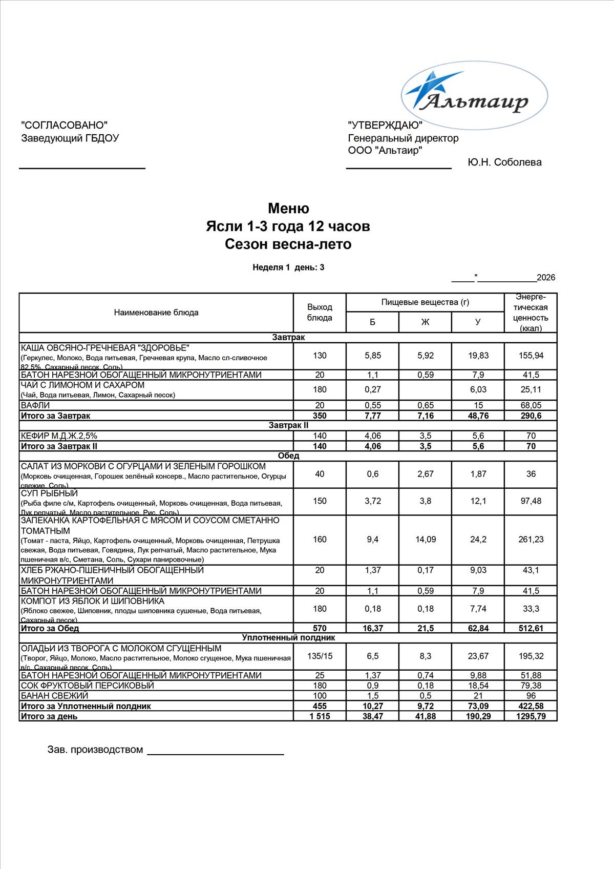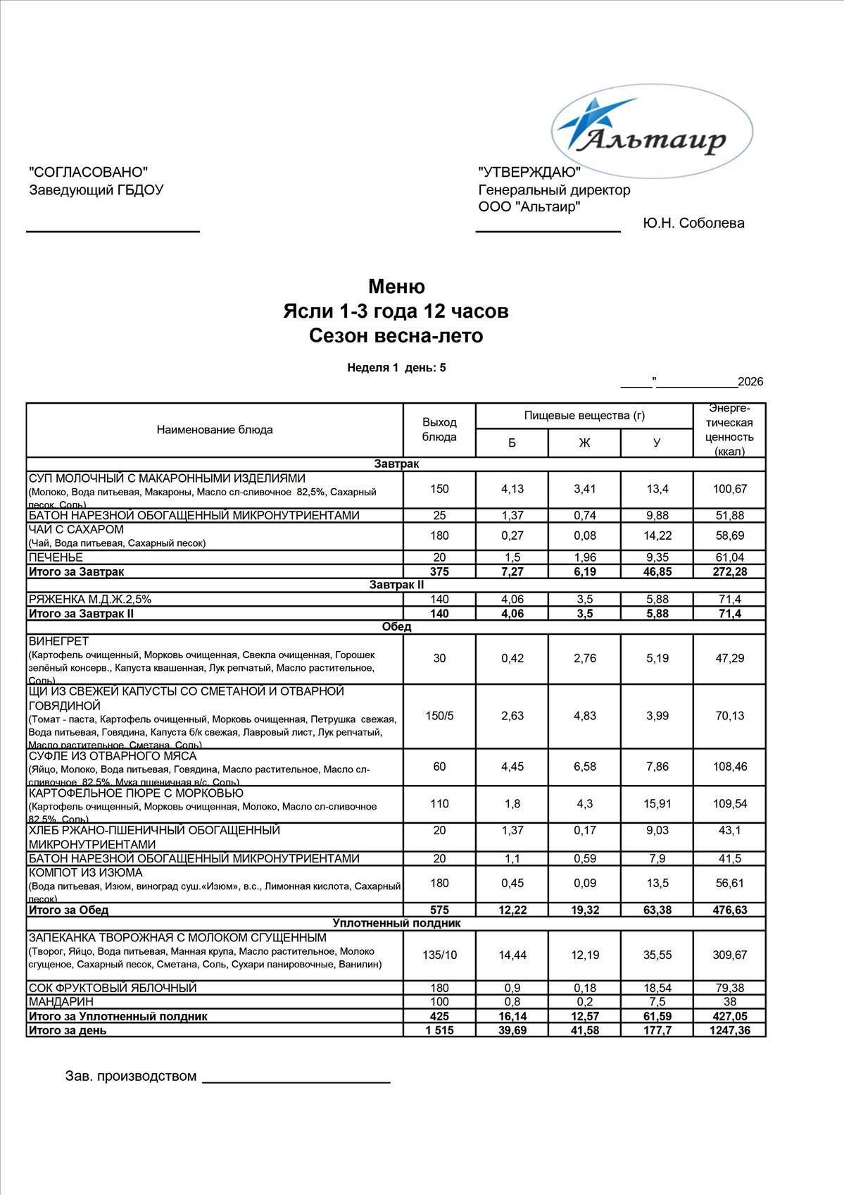 Меню для детей ясельного возраста (1 - 3 года) с пребыванием 12 часов